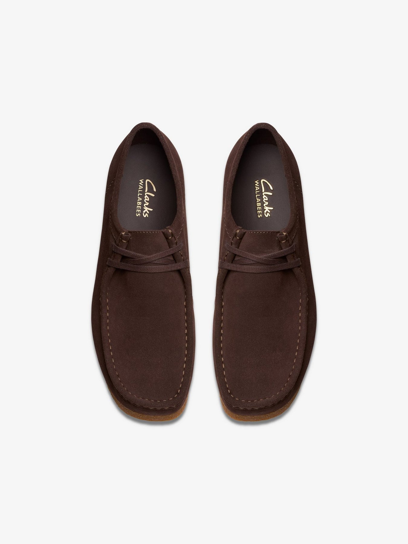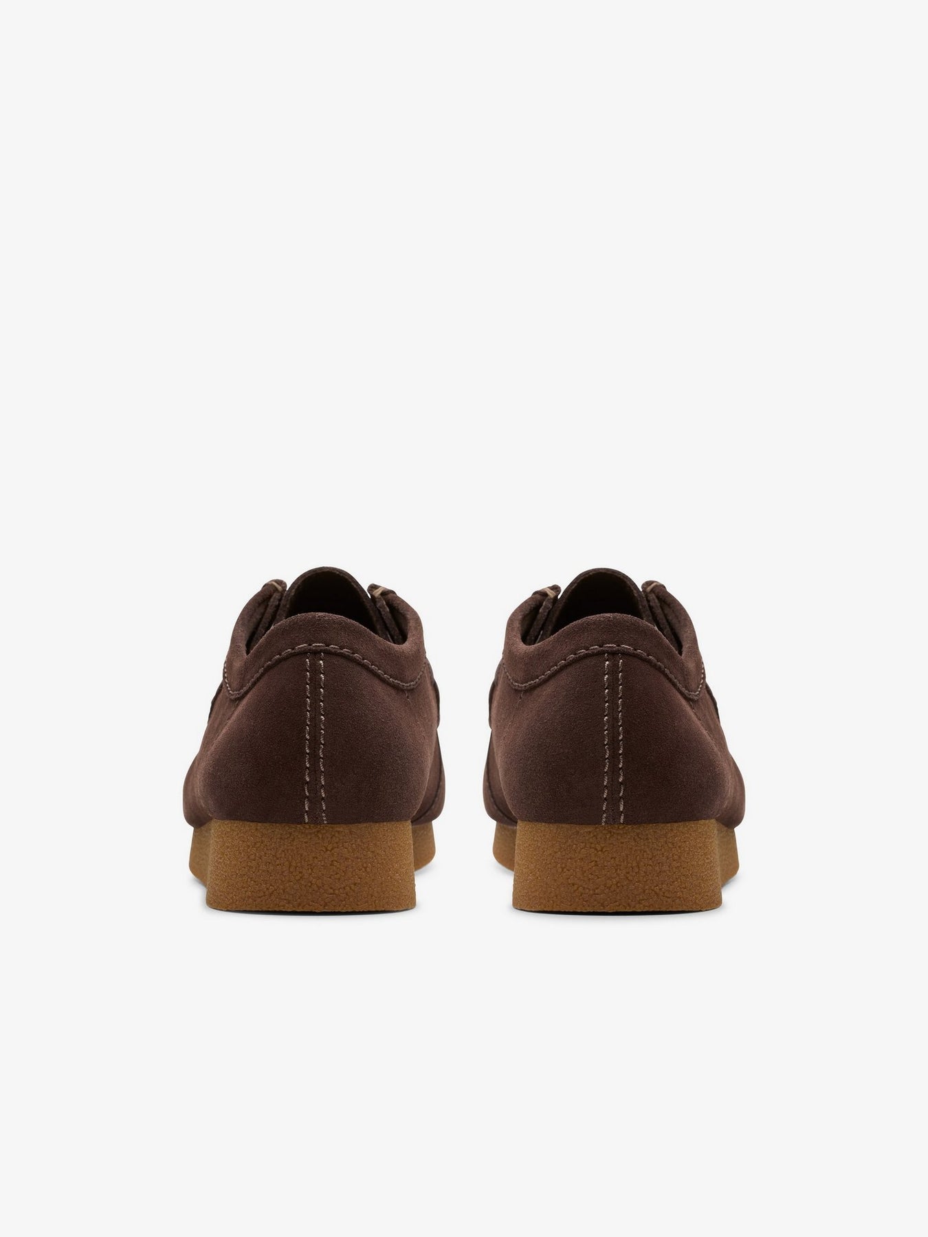 Realizzata in pelle scamosciata premium color marrone scuro (Dark Brown), la Wallabee presenta la tipica struttura moc toe con cuciture a vista e lacci in tono, che richiamano il design autentico Clarks.
