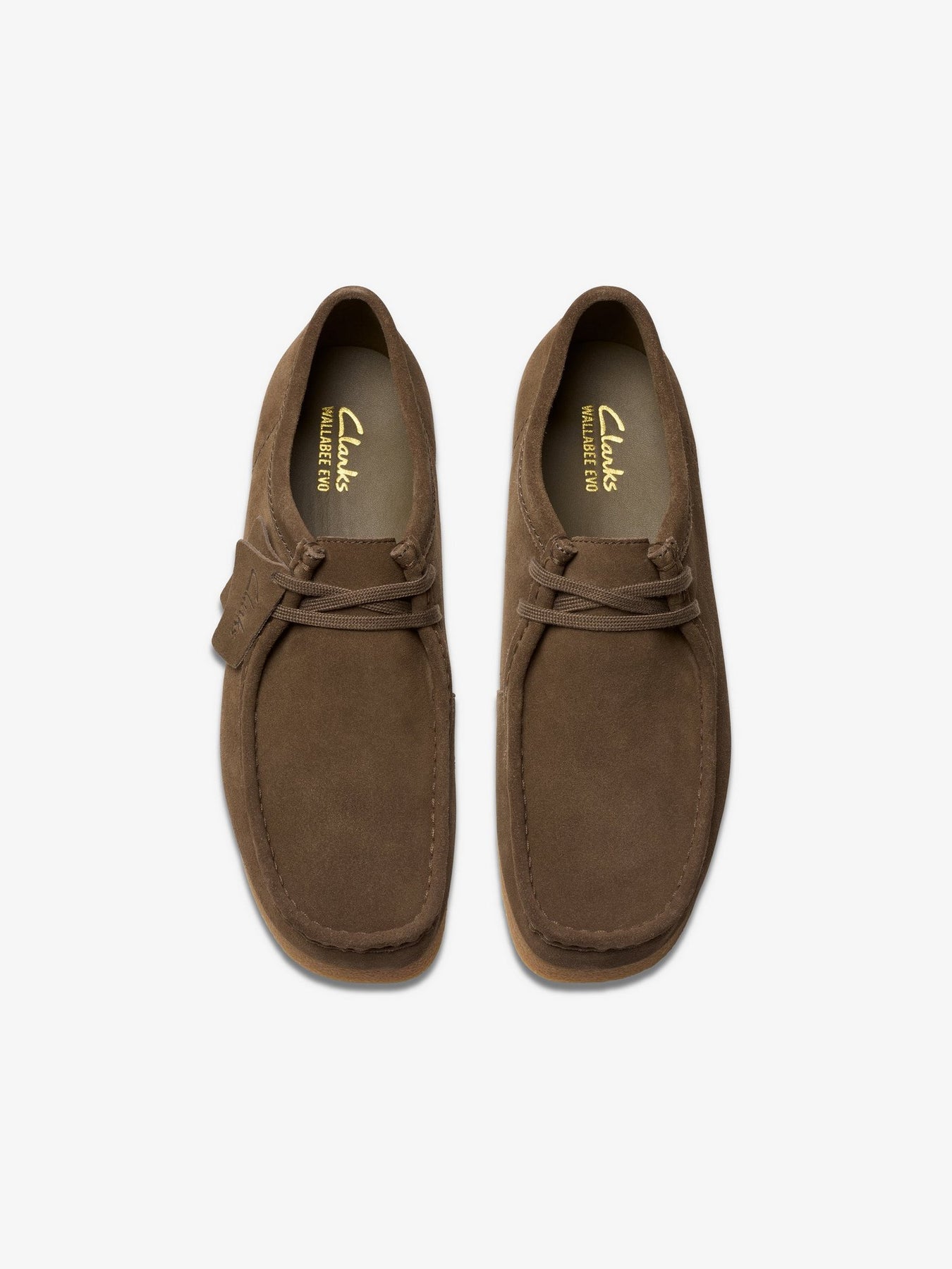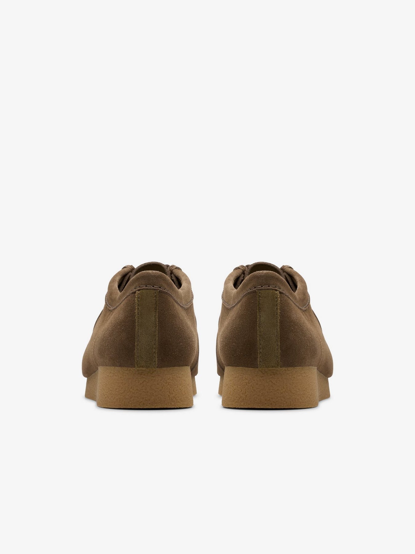 Realizzata in pelle scamosciata premium color verde oliva scuro (Dark Olive), la Wallabee presenta la classica struttura moc toe con cuciture a vista e tag Clarks in pelle, elementi distintivi del modello originale.