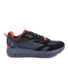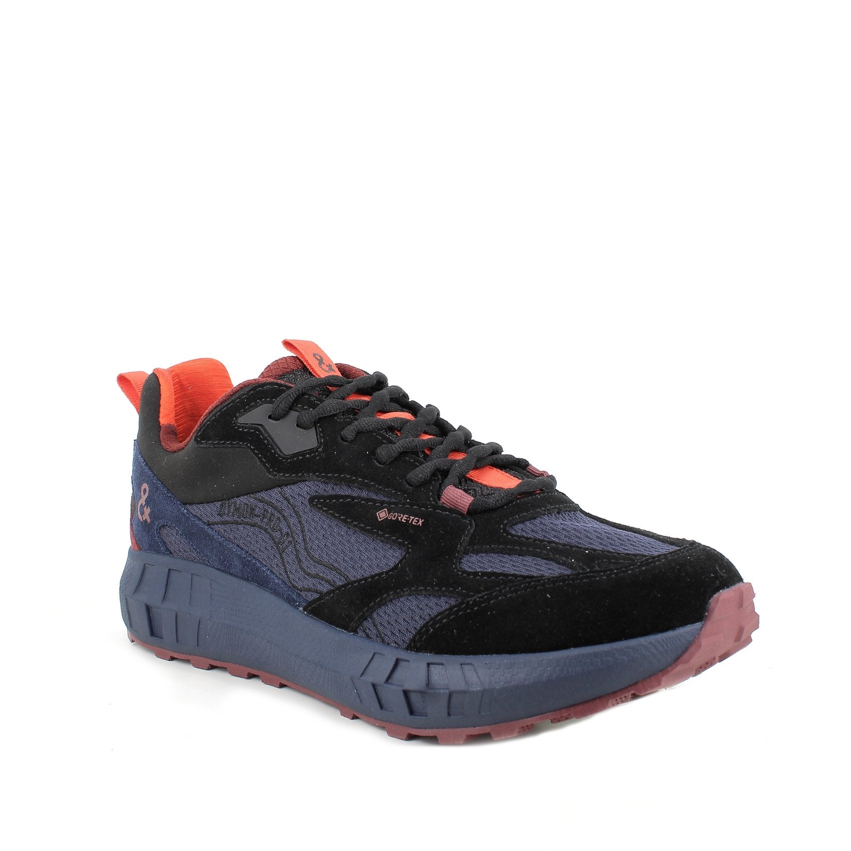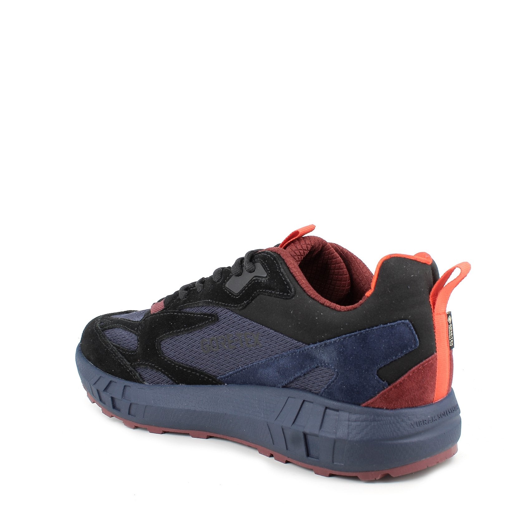 Realizzata in pelle e tessuto tecnico traspirante nei toni del blu e nero, con inserti rosso-bordeaux a contrasto, presenta un look dinamico e urbano. La suola chunky in gomma garantisce stabilità, ammortizzazione e ottima resistenza su ogni superficie.