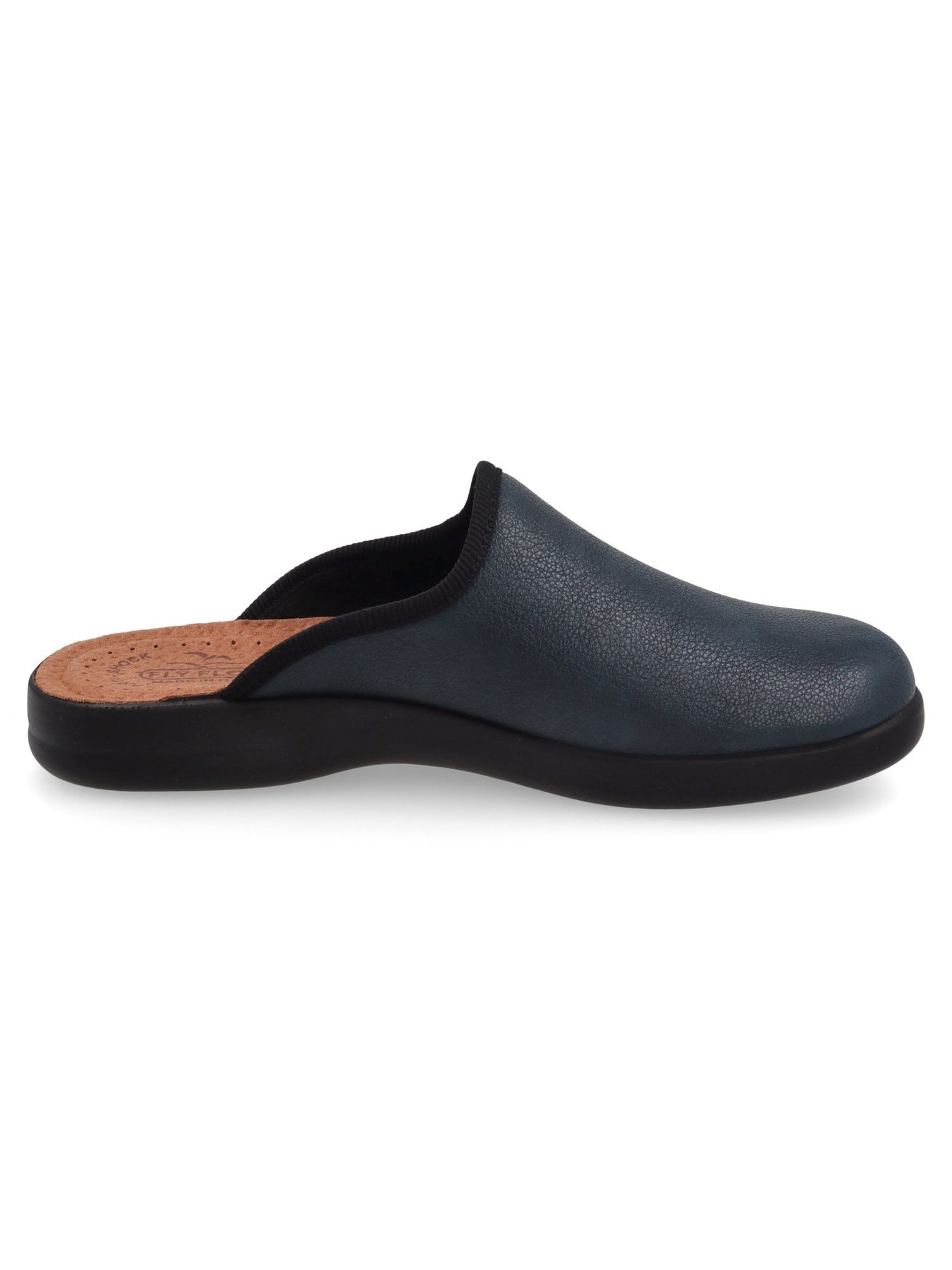 Realizzata in morbida pelle sintetica blu, questa pantofola presenta un design essenziale e raffinato, arricchito dal logo con bandiera italiana sul lato che ne sottolinea la produzione Made in Italy. L'interno è dotato di plantare anatomico in sughero naturale, studiato per sostenere l'arco plantare e favorire la corretta postura del piede.