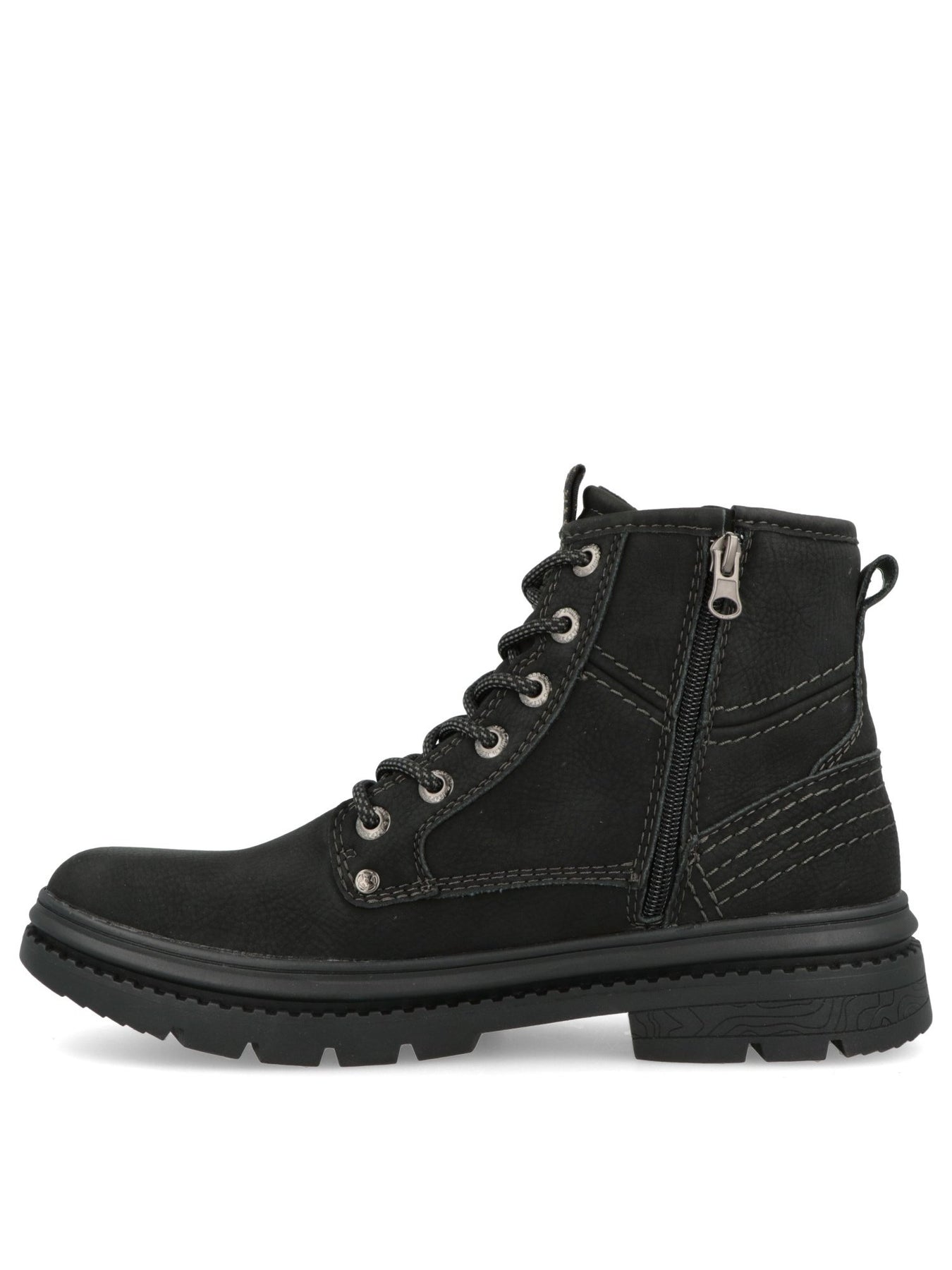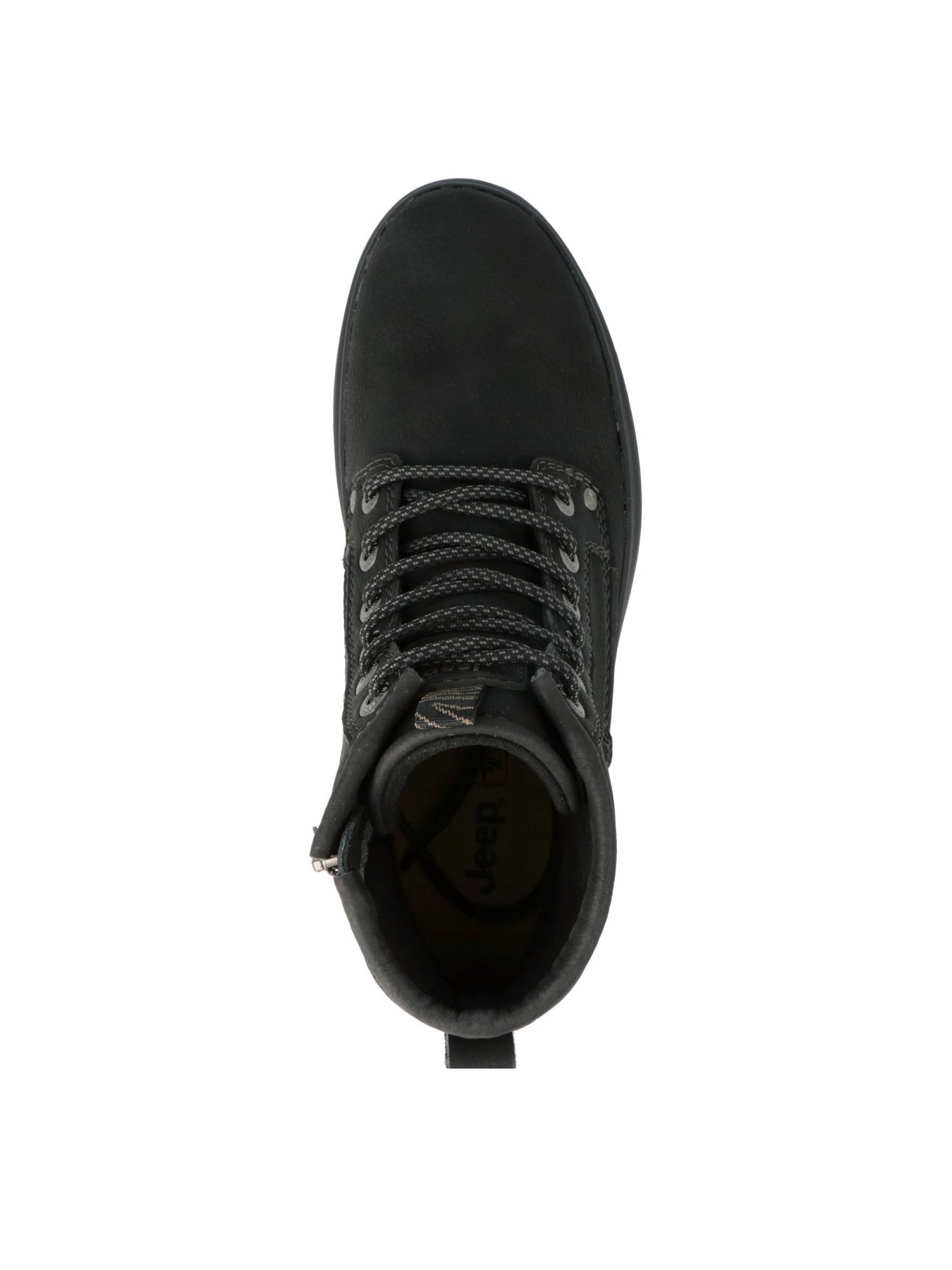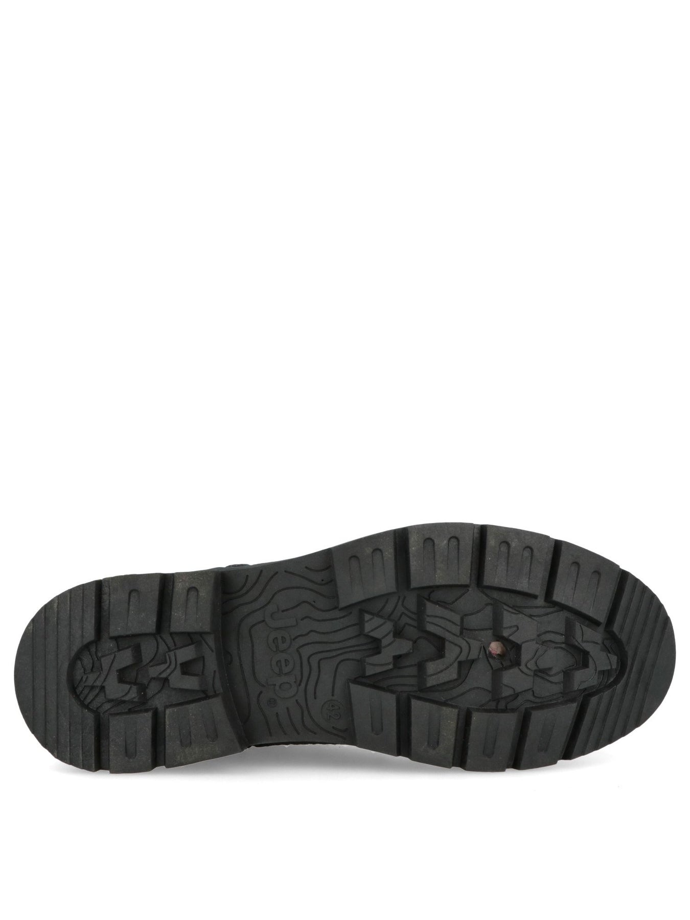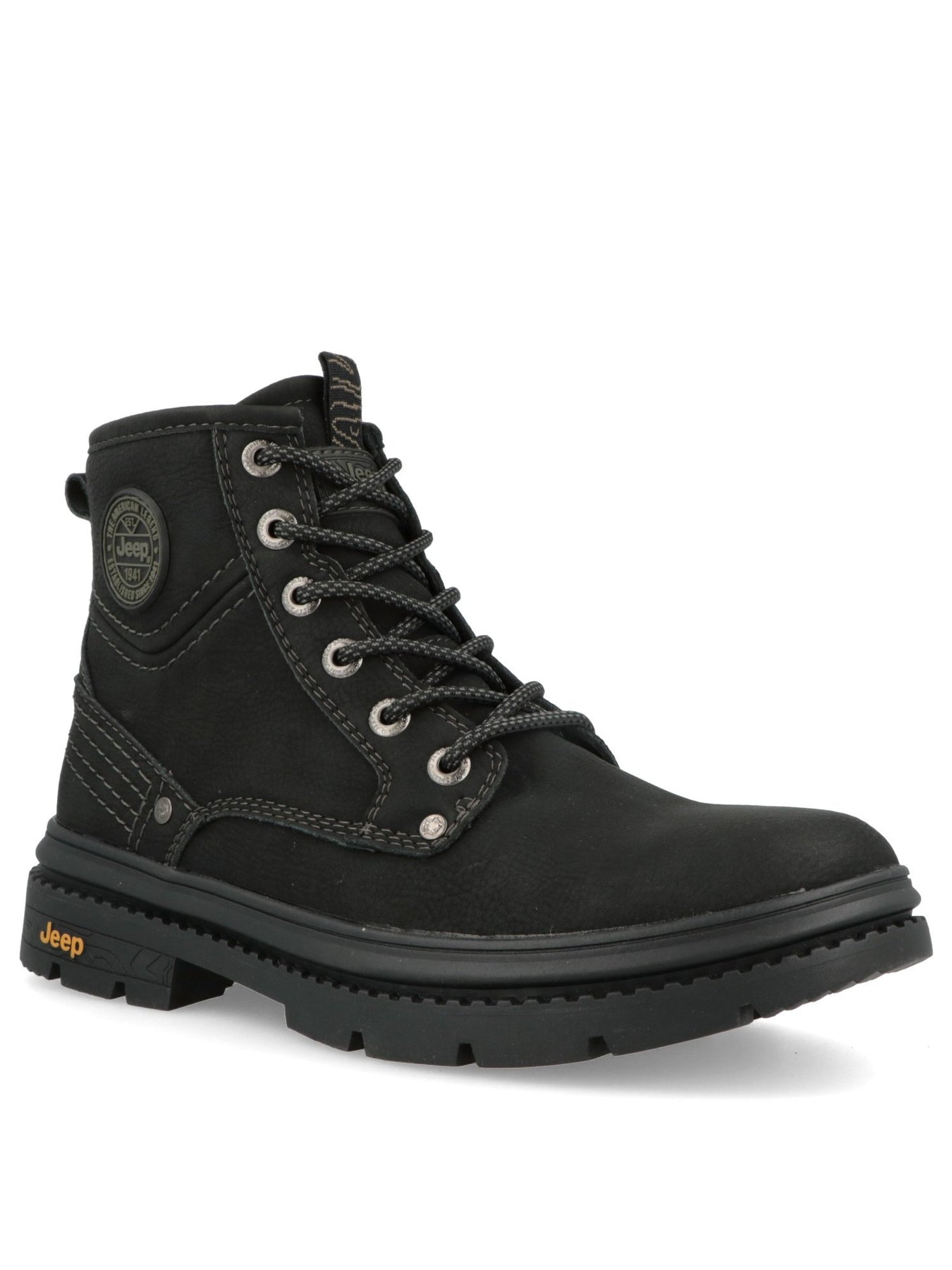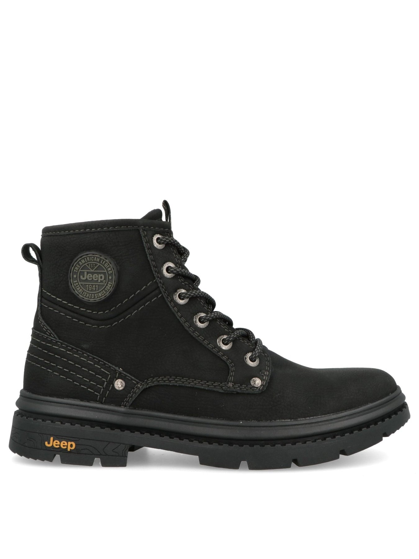 Realizzato in pelle effetto nabuk nera, questo scarponcino presenta un look grintoso e curato nei minimi dettagli: cuciture rinforzate a contrasto, logo JEEP in rilievo sulla caviglia e occhielli metallici che ne esaltano il carattere tecnico. La chiusura con lacci assicura una calzata precisa e stabile, mentre il collarino imbottito garantisce comfort e protezione durante tutto il giorno.