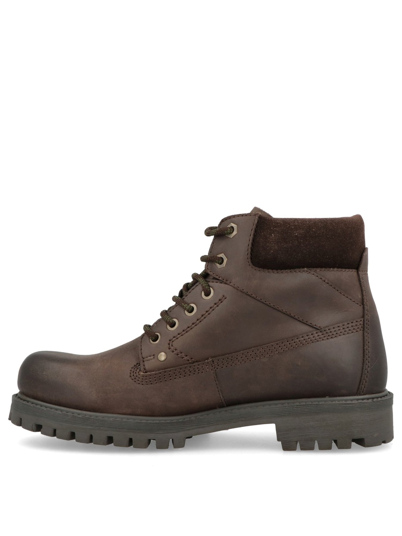 Realizzato in pelle naturale color testa di moro, questo scarponcino presenta cuciture rinforzate e un collo imbottito in tessuto tono su tono per garantire maggiore comfort e sostegno alla caviglia. La chiusura con lacci e occhielli metallici assicura una calzata stabile e regolabile, ideale per affrontare ogni tipo di terreno o condizione.